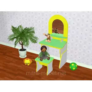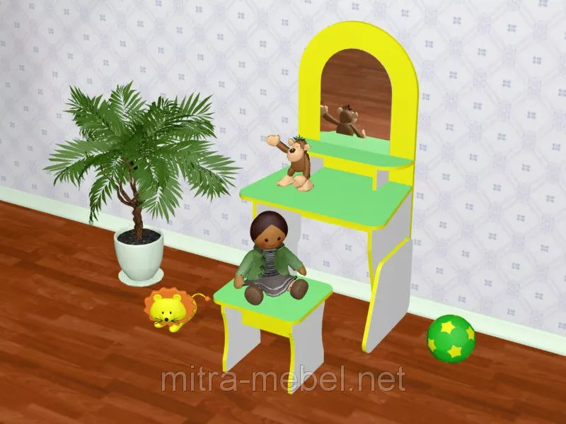 предметов, напоминающие салон красоты: стол с зеркалом и стульчик.