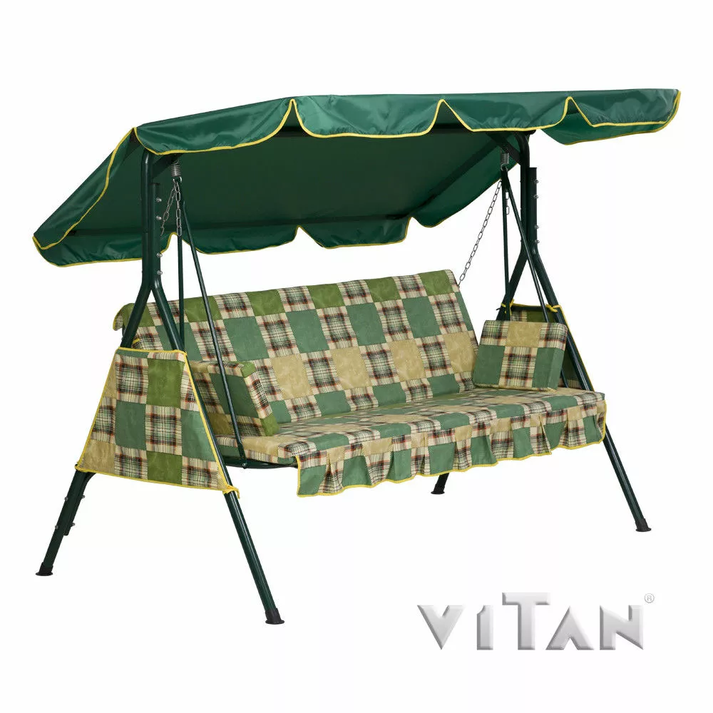 Каркас конструкции: стальная труба диаметром ?38 мм, толщиной стенки 1.2 мм , с полимерным покрытием для защиты от погодных воздействий. Комплектующие: сидение-бязь, наполнитель поролоновый 50 мм, тент-оксфорд. Сидение (основа): блок пружинный, проволока из стали, глубиной 540 мм, шириной 1700 мм. Размеры: глубина 1170 мм, высота 1580 мм, ширина 2100 мм. Упаковочный размер: 2 места (2100*600*340мм.) Вес: 33,5 кг. Цвет: жёлтая или зелёная клетка. Нагрузка: до 280 кг.