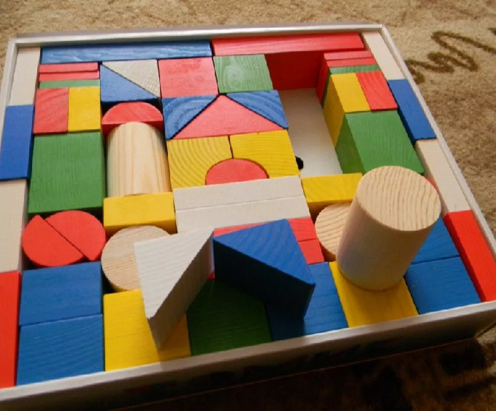 Деревянный конструктор состоит из разнообразных крупных (7–10 см)