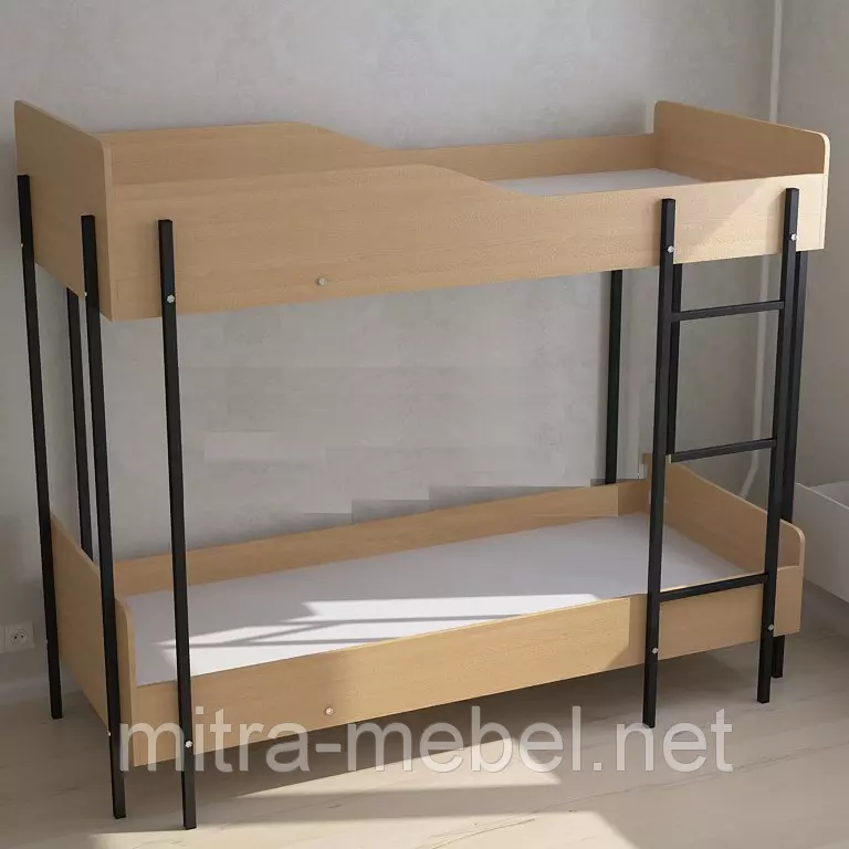 Кровать двухъярусная предназначена для оборудования общежитий, гостиниц, мотелей и хостелов. Обкладка кровати состоит из изголовья, подножья и двух царг для каждого яруса, изготовлена из 16-ти миллиметровой ламинированной ДСП, по умолчанию цвет декора — бук, при желании может быть использован любой декор ДСП, в этом случае стоимость рассчитывается индивидуально. На торцы нанесена пластиковая кромка толщиной 0,6 мм. Каркас разборной, состоит из стоевых, рамок под лежаки и лестницы, изготовлен из металлической трубы квадратного сечения 2525 мм, а перемычки рамок под лежаки и перекладины лестницы из трубы — 2020 мм и толщиной стенки не менее 1 мм, окрашен порошковой краской стойкой к механическим повреждениям, ультрафиолетовому излучению и атмосферным воздействиям. Кровать двухъярусная изготовлена с каркасом черного цвета, при желании можно покрасить в любой другой по раскладке RAL. Обкладка соединяется с каркасом с помощью болтового соединения. Лежаки кровати изготовлены из 16-ти миллиметровой шлифованной ДСП. По требованию заказчика кровать может быть изготовлена нестандартной высоты, длины или ширины, в этом случае цена изготовления кровати просчитывается соответственно измененным параметрам. Данная кровать рассчитана под матрацы размером 190080070 мм. Все технологические отверстия закрыты пластиковыми заглушками.