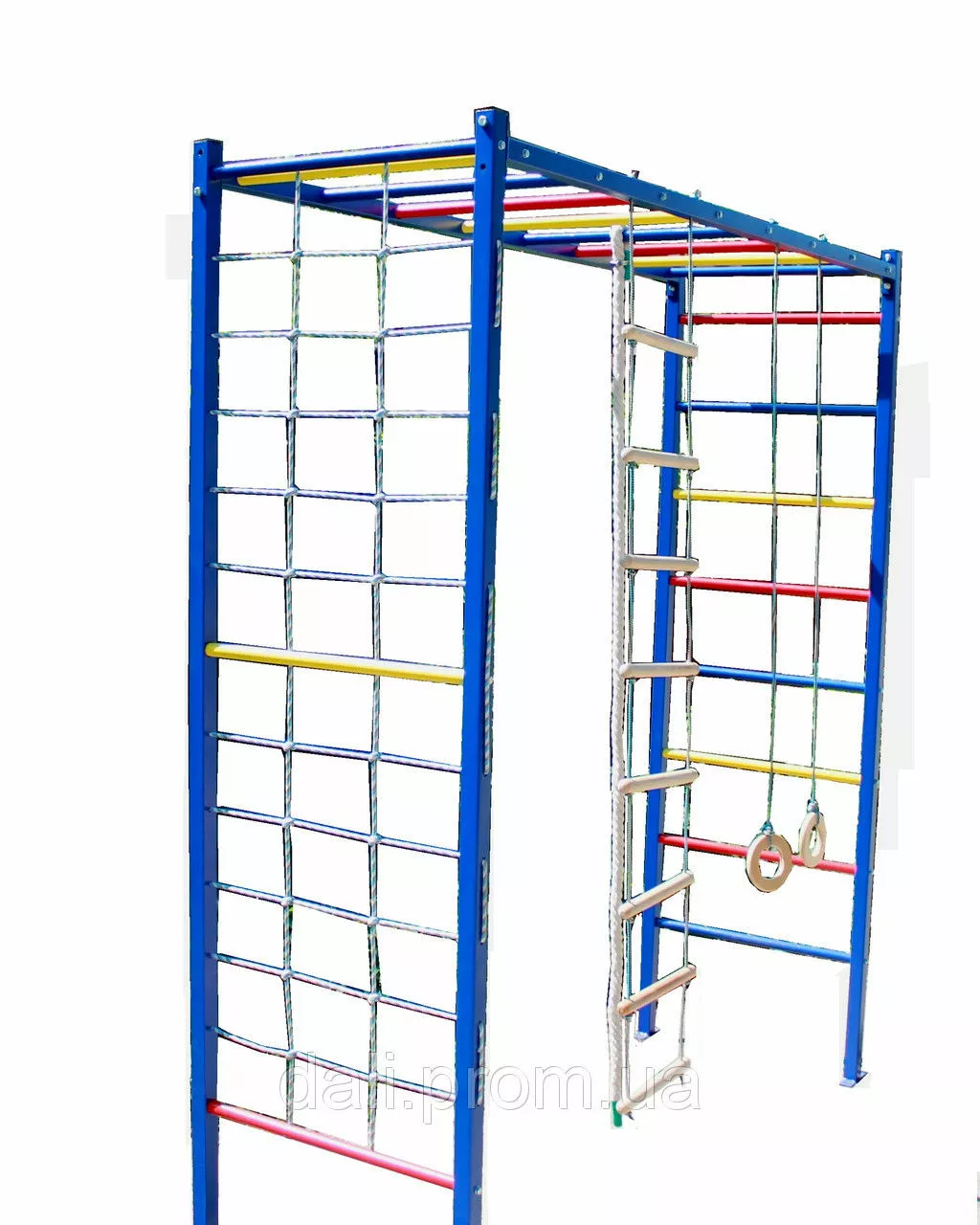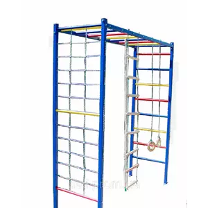 - Комплектация: Семь предметов (шведская стенка, рукоход, гладиаторская сетка, канат, веревочная лестница, кольца, комплект крепежей для сборки)